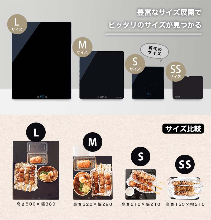 フードウォーマープレートは、天板の大きさが違う4種類あります。